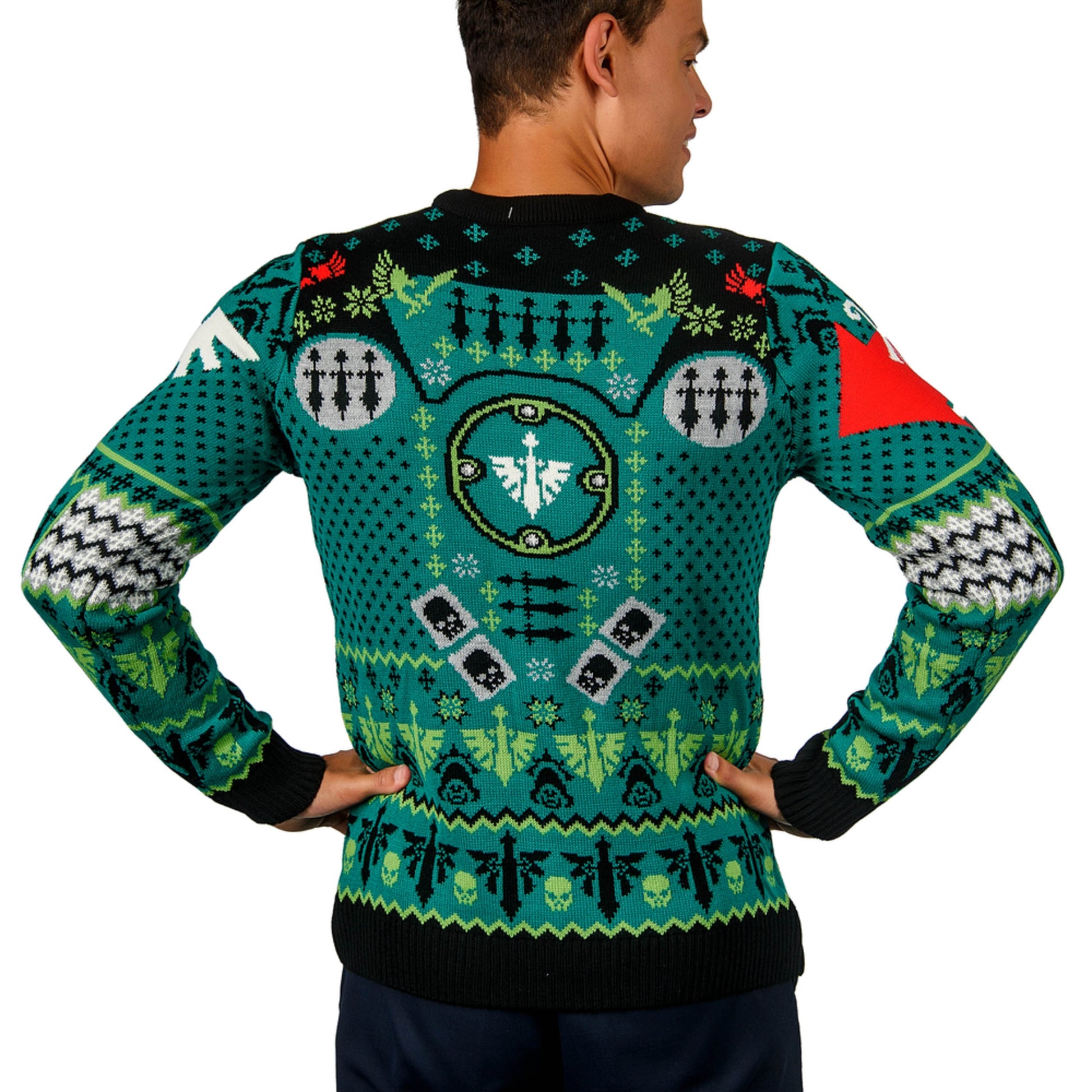 Stand resolute this holiday with the Warhammer 40,000: Dark Angels Christmas Jumper. Featuring the Dark Angels faction logo and chapter symbols, this sweater is perfect for those who pledge loyalty to the First Legion.